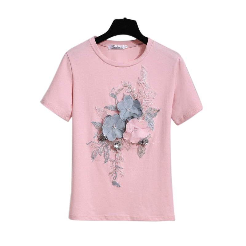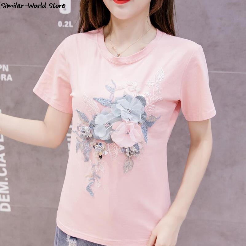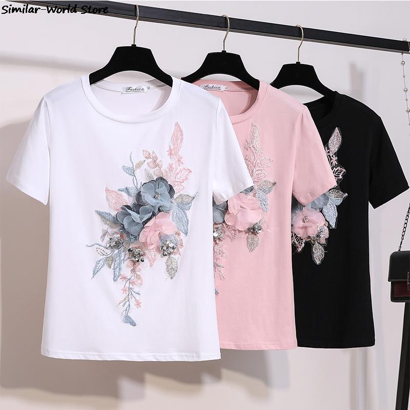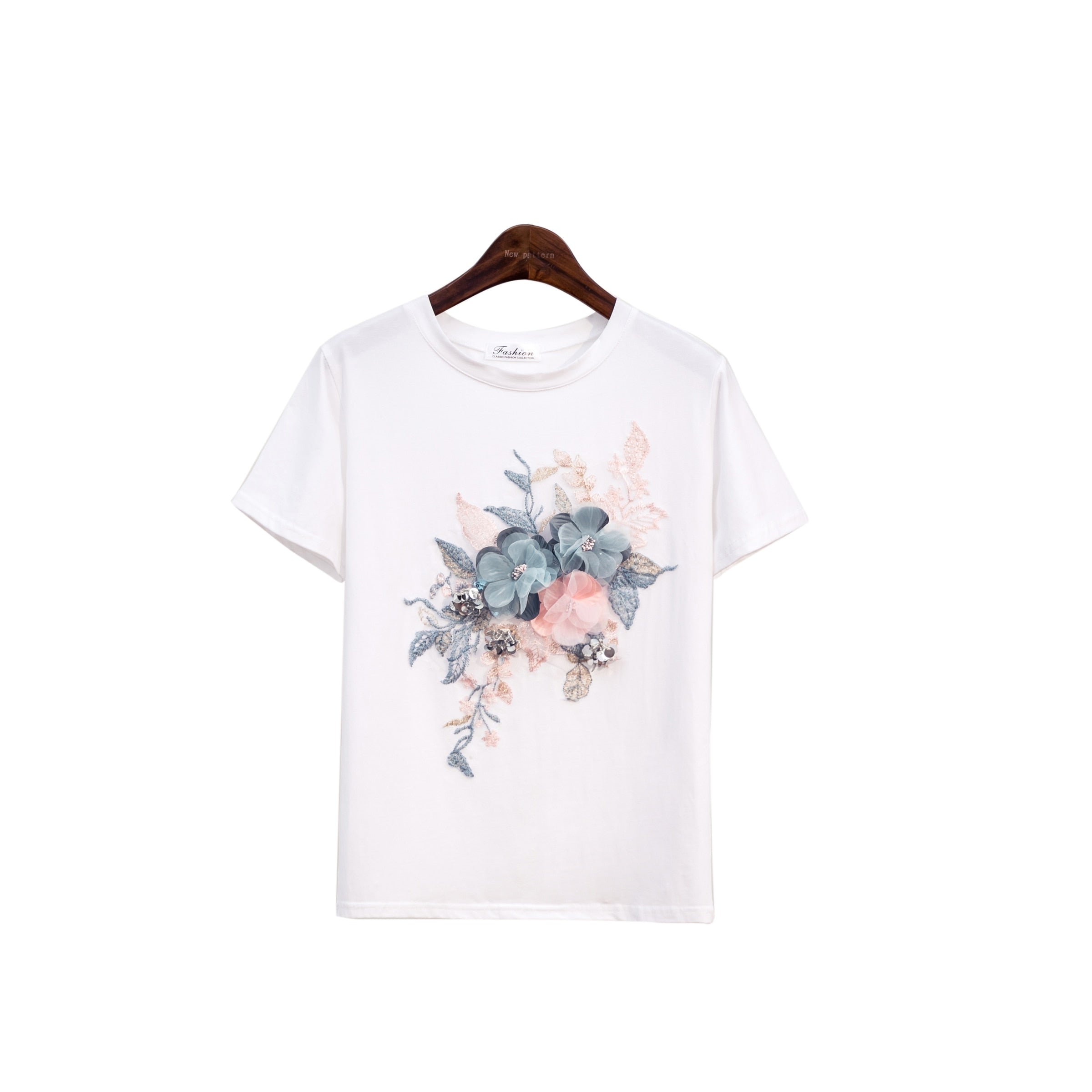 Summer Embroidery Beading Flower Tshirts Women O Neck Short Sleeve Girl Tops T-shirts Women Floral Tee Shirt