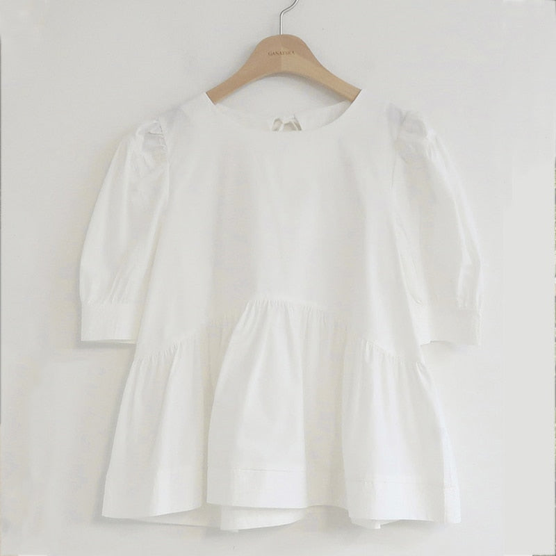 Summer New 2021 Solid Cotton White Blouse Korean Version Sweet Cute Round Collar Bubble Short Sleeve Shirt Blusa Feminina 14038