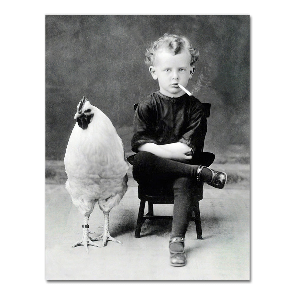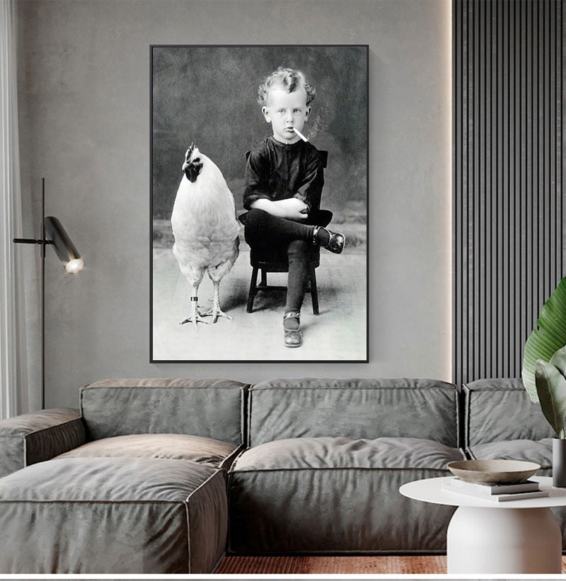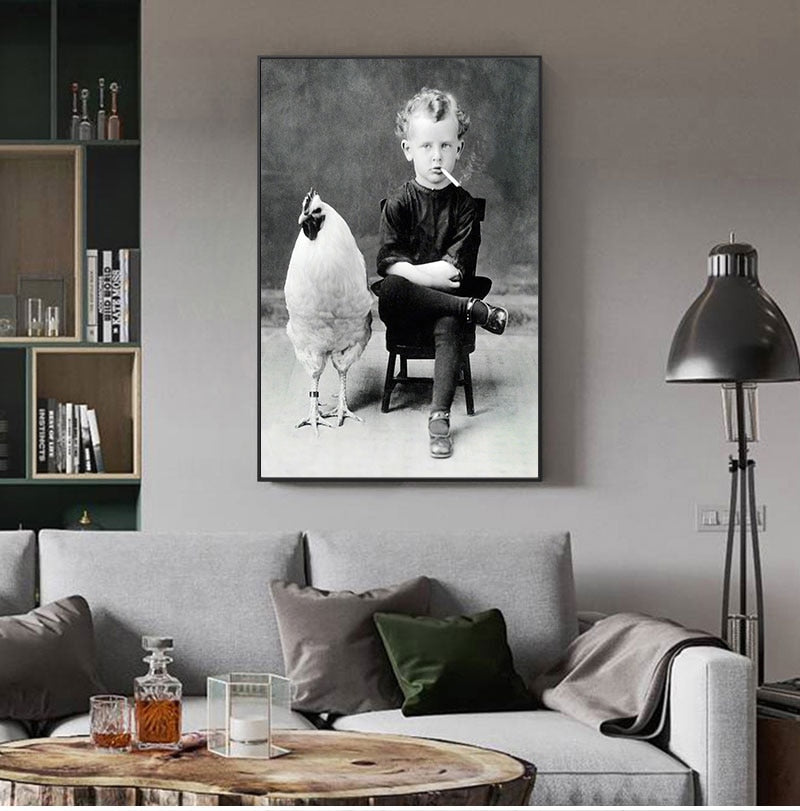 Weird Vintage Photography Poster Prints , Boy Smoking With His Chicken Pet Antique Portrait Art Canvas Painting Wall Art Decor