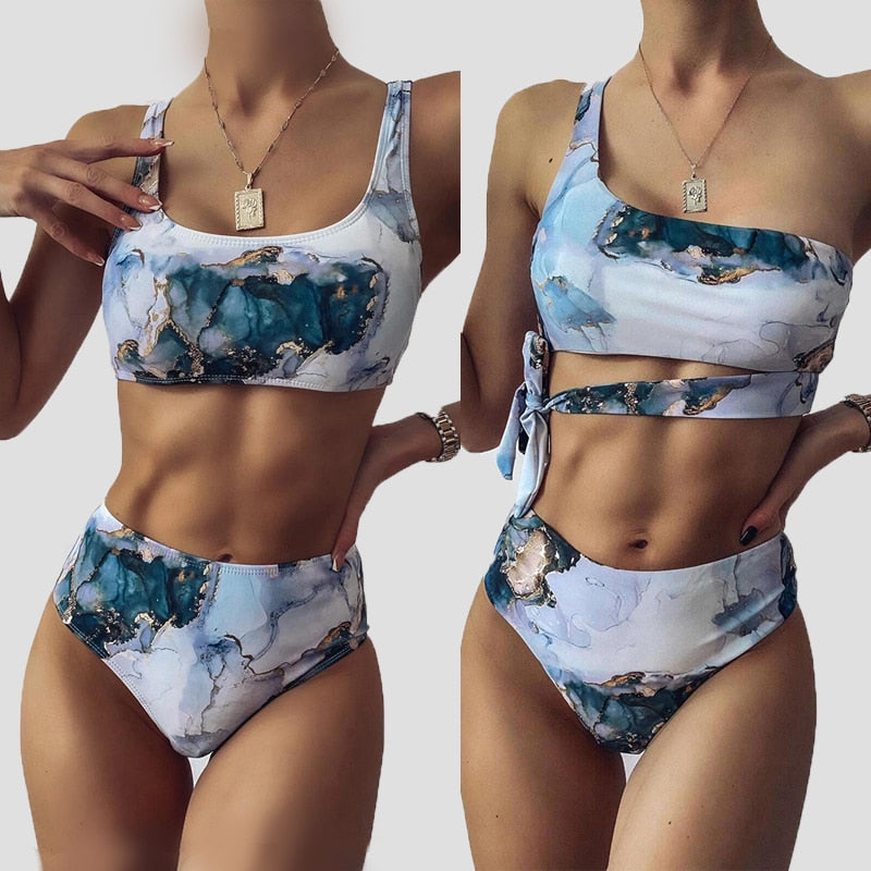 Women Print Bikini 2021 Summer New Marble Printed Push Up Bandeau Swimsuits Sexy High Waist Beach Sport Bathing Suit Biquinis